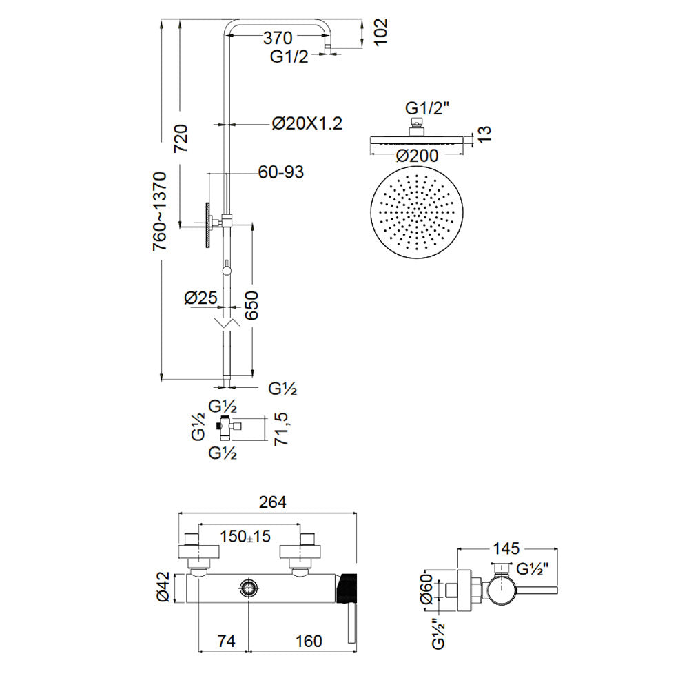 Περιγραφή: Ντουζιέρα 2 εξόδων με κολώνα ρυθμιζόμενου ύψους 76-137εκ.