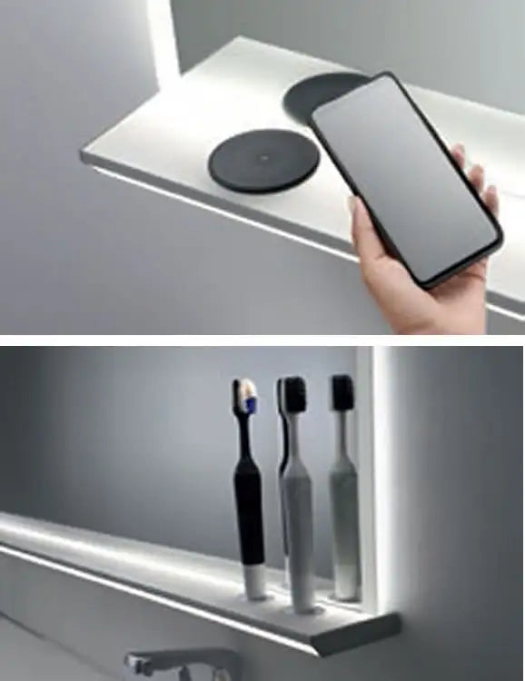 Περιγραφή: Καθρέπτης 100X72.5 εκ. φωτιζόμενος LED, με ακρυλικό πλαίσιο και φωτιζόμενη εταζέρα. Ασύρματη φόρτιση κινητού & ηλεκτρικής οδοντόβουρτσας ORAL -B (2 θέσεων). Φωτισμός περιμετρικός / εταζέρα