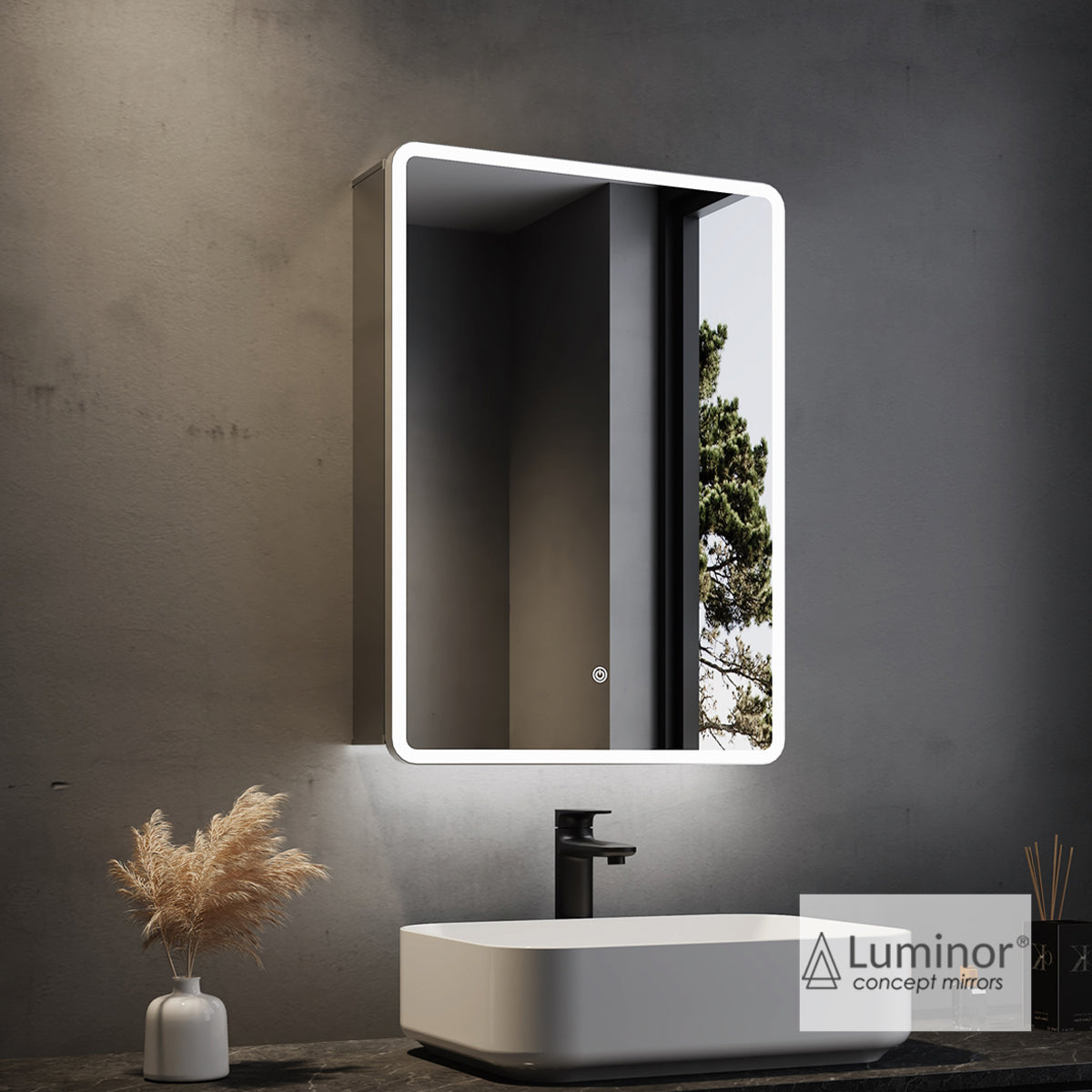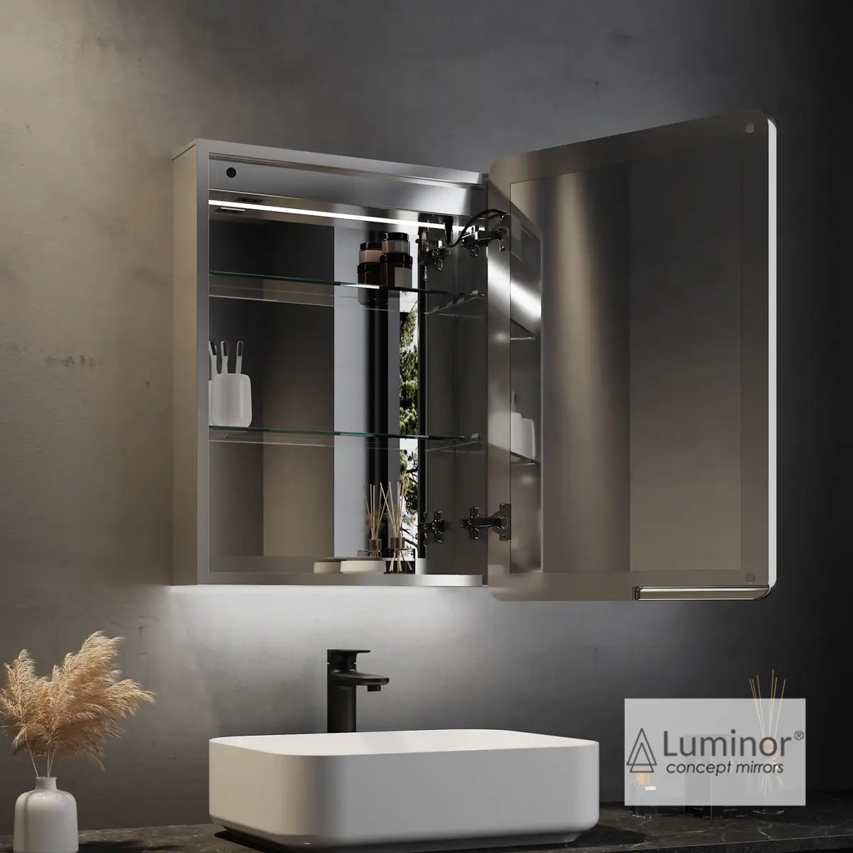 Περιγραφή: Ντουλάπι με φωτιζόμενο καθρέφτη LED εσωτερικά / εξωτερικά, με πλαίσιο αλουμινίου, και ενσωματωμένη πρίζα 230V. Φινίρισμα Αλουμινίου