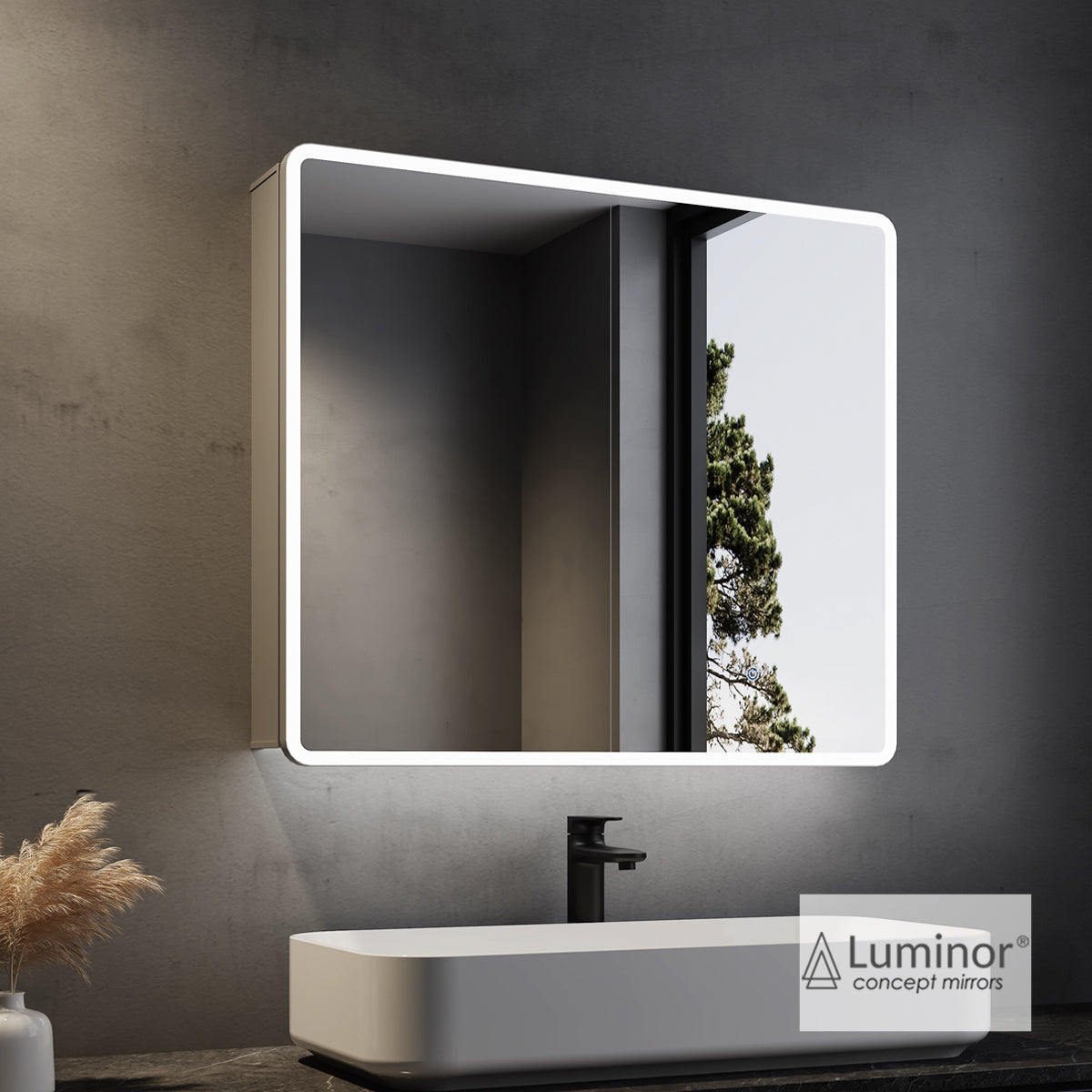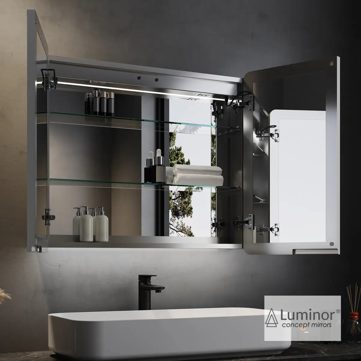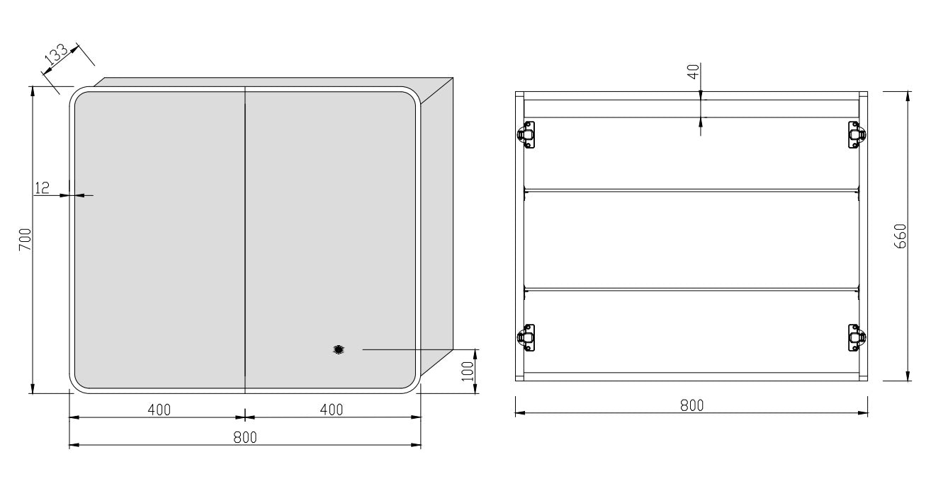 Περιγραφή: Ντουλάπι με φωτιζόμενο καθρέφτη LED, με πλαίσιο αλουμινίου, και ενσωματωμένη πρίζα 230V. Φινίρισμα αλουμινίου